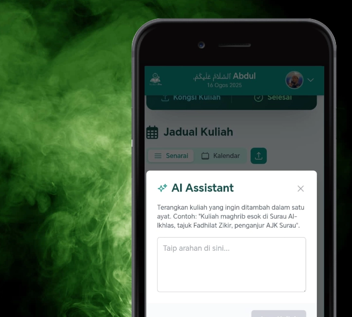 Pembantu AI: Tambah kuliah baharu dengan hanya menulis ayat biasa (cth: "Kuliah maghrib esok di Masjid Al-Falah").